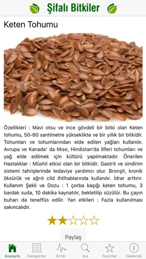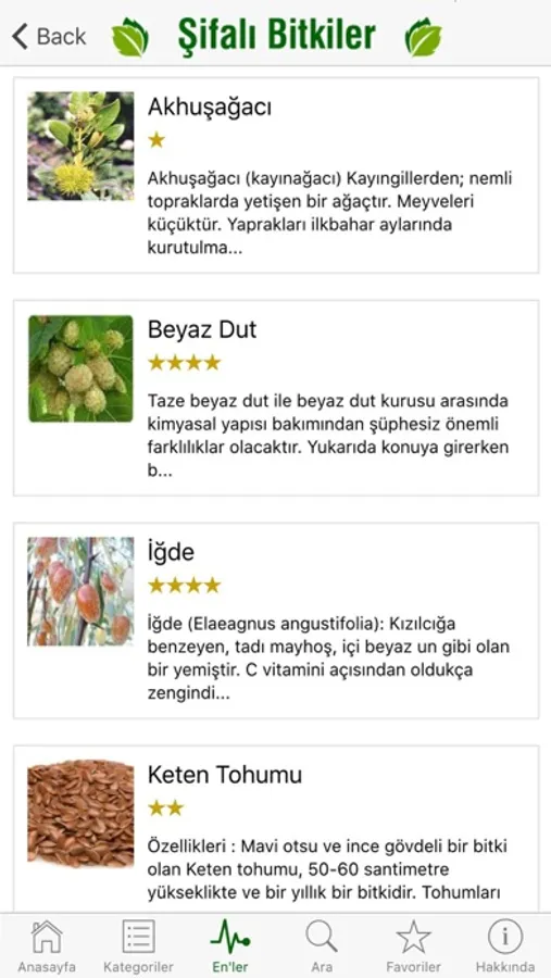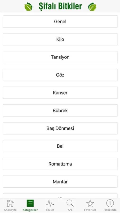 Her kategori kendi içerisinde ilgili rahatsızlığa sifalı gelecek bitki hakkında bilgi içermektedir. Örneğin; Tansiyon bölümüne giriş yaptığınız taktirde karşınıza; Arpa, Behmen otu, Çoban Çantası, Çöpleme Bitkisi, Gilaburu, Keklik Gözü Otu gibi tansiyon rahatsızlığına iyi gelebilecek birçok organik bitki hakkında tedaylı bilgi vermektedir.