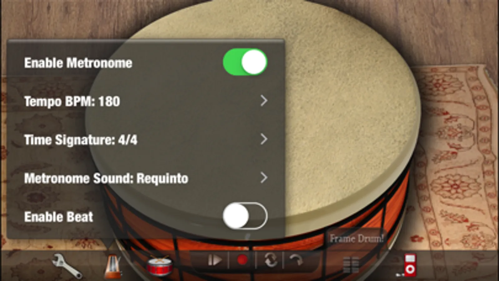 Frame Drum! Free also includes 16 PlayAlong Beats, 22 unique Percussion Beats and 10 Music Beats to play to, as well as 25 different metronome sounds to choose from.