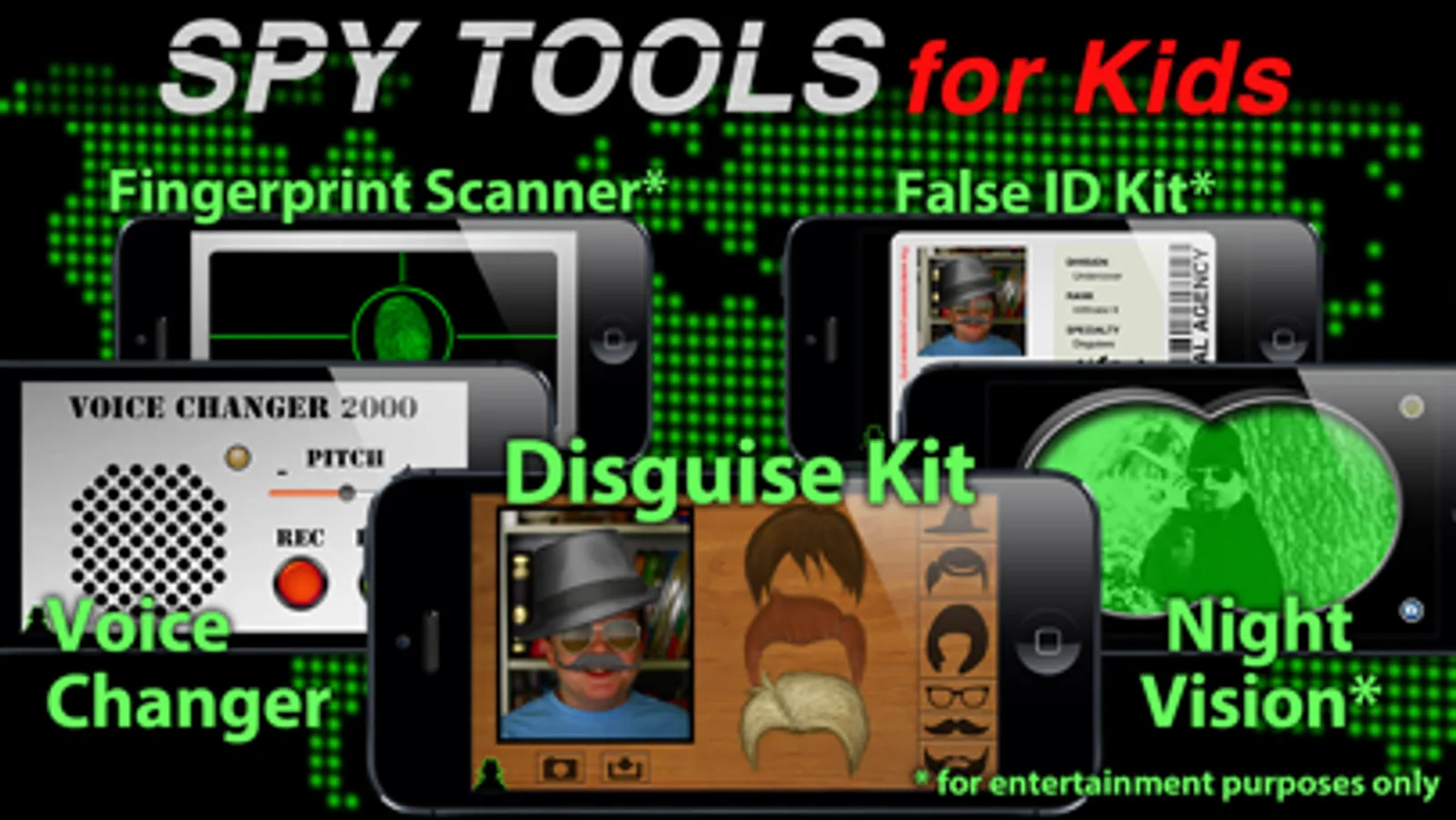 Spy Tools for Kids is a collection of tools for creative pretend play. We've brought together several exciting tools for budding spies to use: a disguise kit, identification kit, fingerprint scanner, voice changer, and night vision goggles.