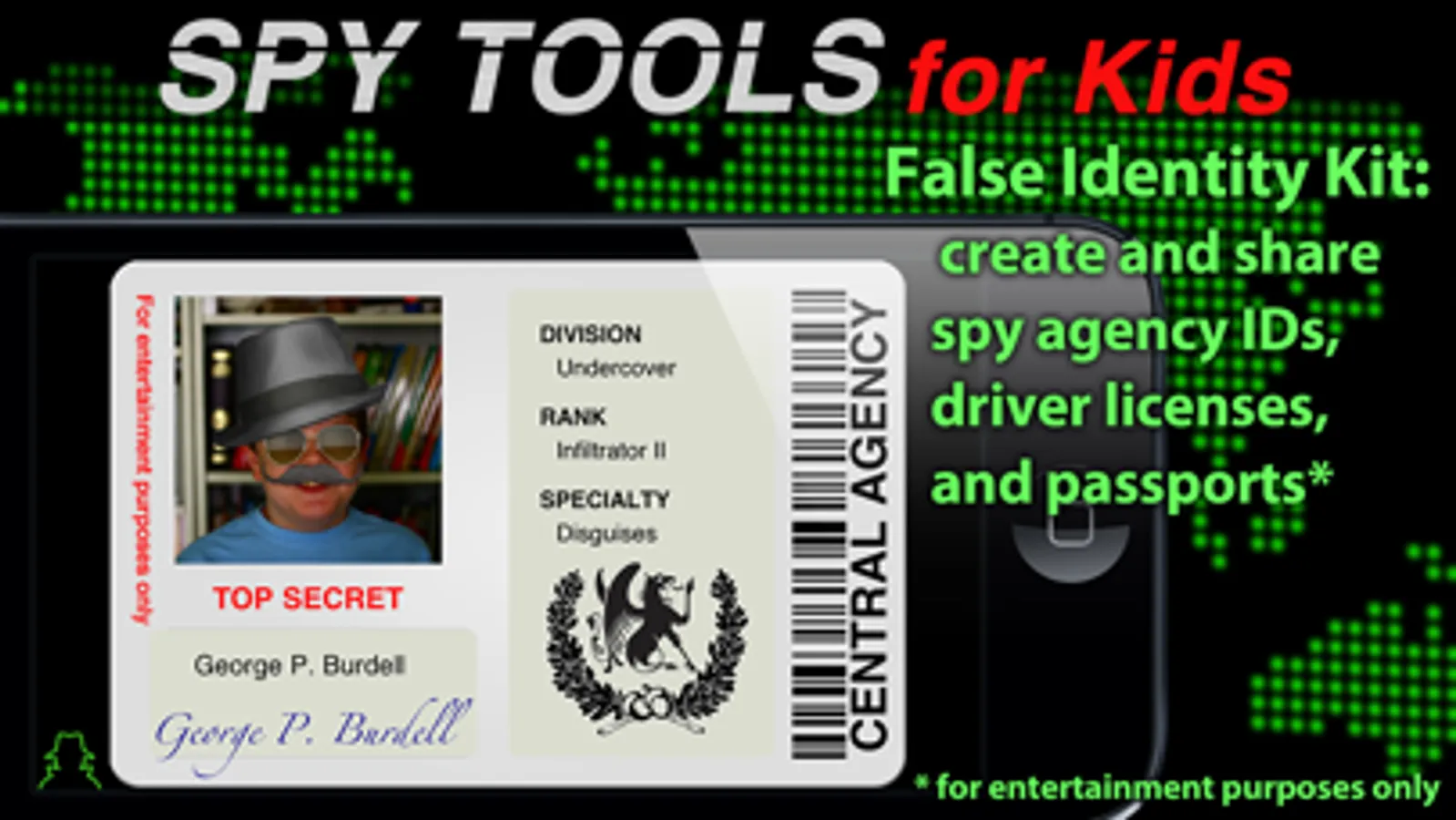 Create your own pretend spy agency ID and other false identities! Tap the photo to use your real picture or a saved disguise. Edit the text fields to customize, including the driver license state, passport country, spy agency name, security clearance, and more. Save your ID to the camera roll by using a long touch.