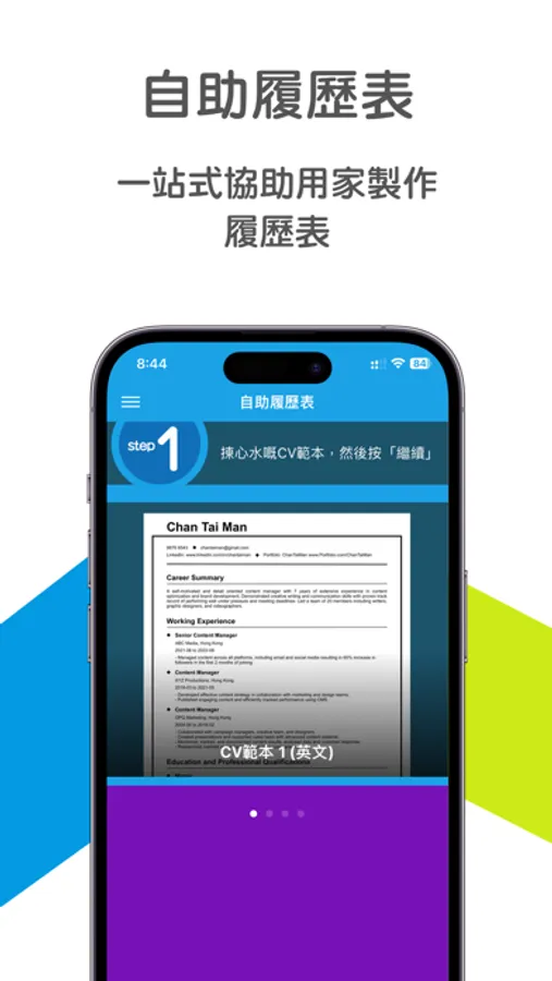 一站式協助用家製作履歷表,只要揀選心水中文或英文範本,再輸入個人資料、工作經驗和學歷,一份個人化的履歷表立即到手。