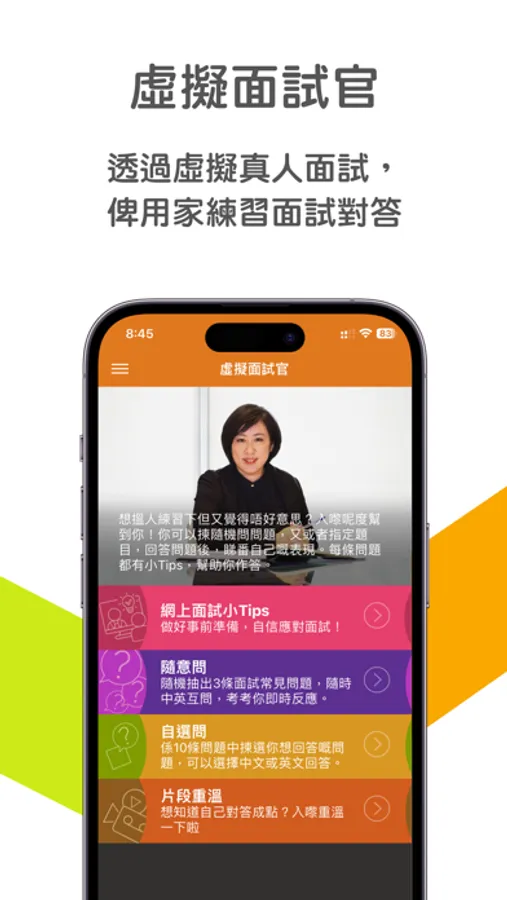 透過虛擬真人面試,俾用家練習廣東話及英文嘅面試對答, 仲有網上面試小Tips ,完成練習後,用家更可以錄影重溫自己嘅對答表現,從而加以改善,增加獲聘機會。