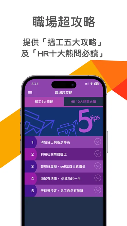 提供「搵工五大攻略」及「HR 10大熱問必讀」參考,用家可於搵工或見工前裝備自己。