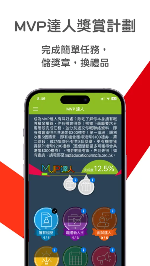 只須善用應用程式內的功能,透過完成8項指定任務,例如製作履歷表、作出面試練習等、獲取實用強積金及求職資訊,便有機會獲得豐富獎品。