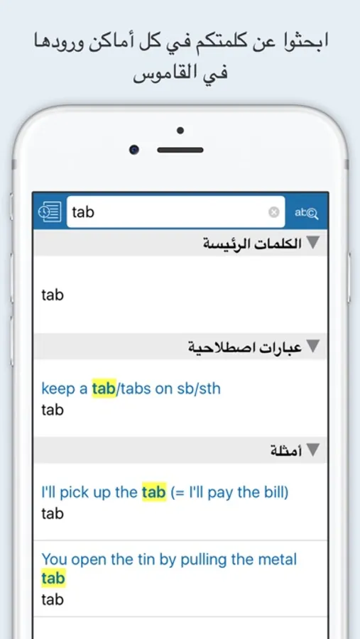 اختر خاصية البحث الموسع لتظهر لك كلمة البحث مستخدمة في أمثلة توضيحية وعبارات اصطلاحية•
