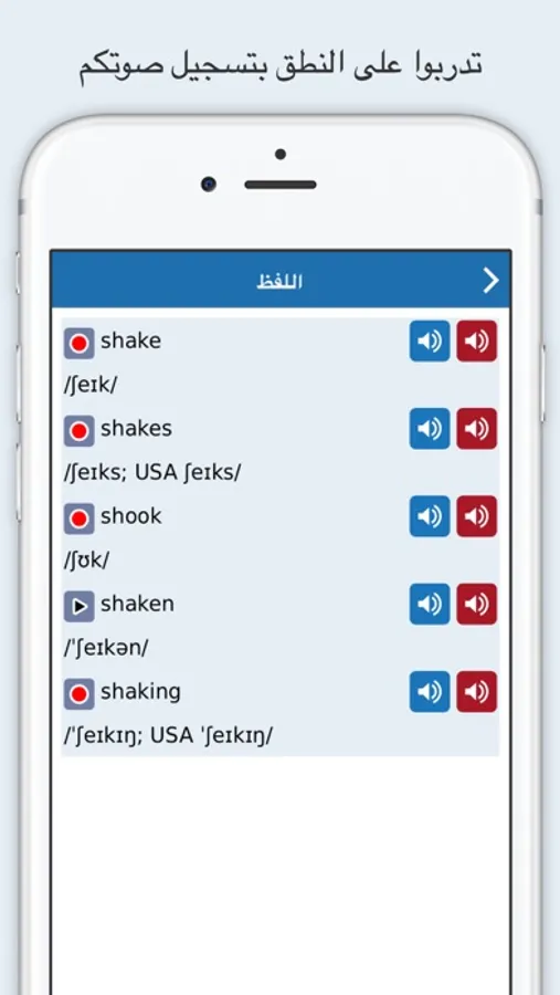 تدرب على اللفظ الصحيح: استمع للفظ الكلمات باللهجتين البريطانية والأمريكية، وسجل اللفظ بصوتك لمقارنته بلفظ القاموس•