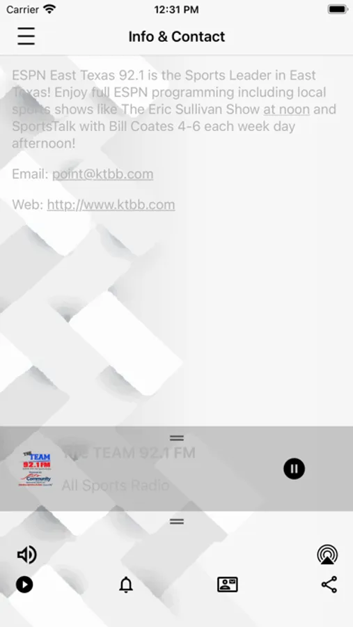 92.1 FM The TEAM Sports Radio is East Texas’ only media outlet that is dedicated fulltime to sports. The TEAM is home to SportsTalk with Bill Coates, the area’s longest-tenured radio program. In addition to its strong local presence, The TEAM is also the East Texas home of the biggest names in national sports broadcasting including Dan Patrick, Clay Travis and Colin Cowherd. The TEAM is the East Texas flagship station of Texas Rangers Major League Baseball, the University of Texas Longhorns football, Texas Tech Red Raiders football, Tyler Junior College football and basketball and Texas A&M Aggies football.