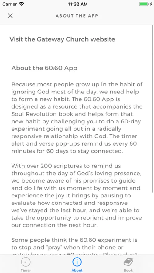 The 60:60 App is designed as a resource to accompany the Soul Revolution book and the sixty-day experiment in faith. Soul Revolution challenges you to do a very simple 60-day experiment going all-out in a radically responsive relationship with God. Jesus likened it to the relationship between a branch and a tree. A branch doesn’t have to do anything at all to produce fruit except stay connected. In the same way he said, “You stay connected to me, you’ll bear much fruit. Apart from me you can do nothing.” (John 15:5 paraphrase). The only problem is that most people grow up in the habit of ignoring God most of the day, so we need help to form a new habit. The verse notifications remind us every 60 minutes for 60 days to stay connected. With over 200 scripture verses to remind us throughout the hours of the day of God’s loving presence, we become aware of his promises to guide and do life with us moment by moment as we remain connected. With every reminder, we pause to evaluate how connected and responsive we’ve stayed the last hour, stop to experience his loving presence in the moment, and reorient to improve our connection with him in the next hour.