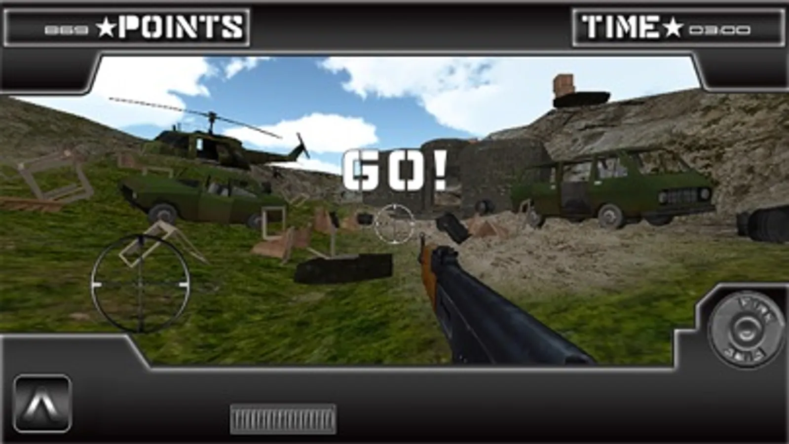 You have the possibility to fire with all the guns and destroy the scene. You can destroy boxes, a barrack, pallets, cars, one helicopter, etc.