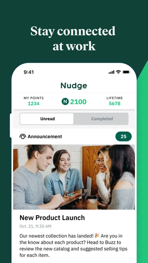The Nudge app helps you stay connected at work. Access company updates on-the-go, quickly chat with your colleagues, and easily share your feedback and ideas. The best part? Nudge makes your job easier and your company better.