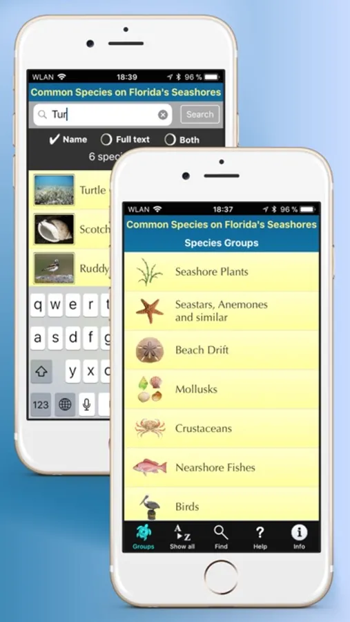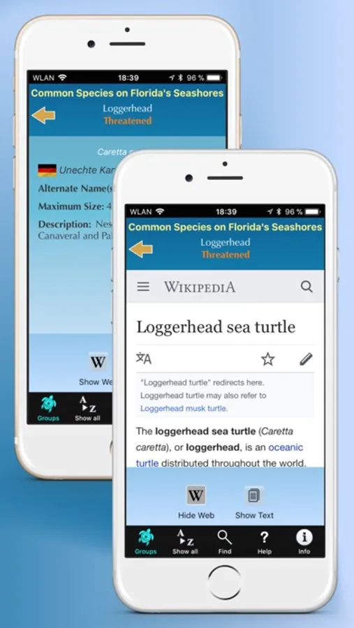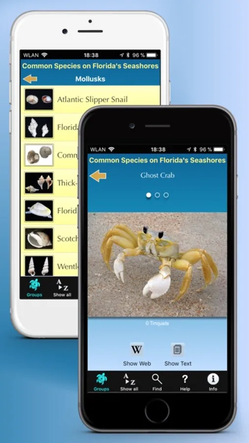 This app shows the 133 most common species found on Florida seashores. For each species there are two or three high-resolution pictures, a brief description, and a link to view the corresponding Wikipedia pages within the application window. All descriptive information is in English, the animal names are also shown in scientific (Latin) denomination and in German.