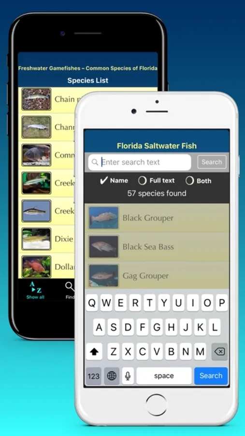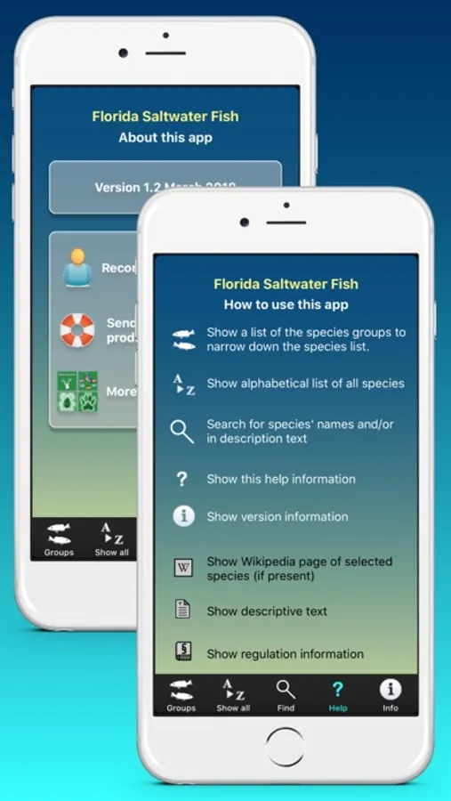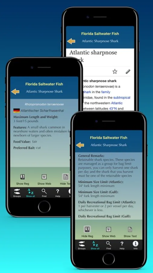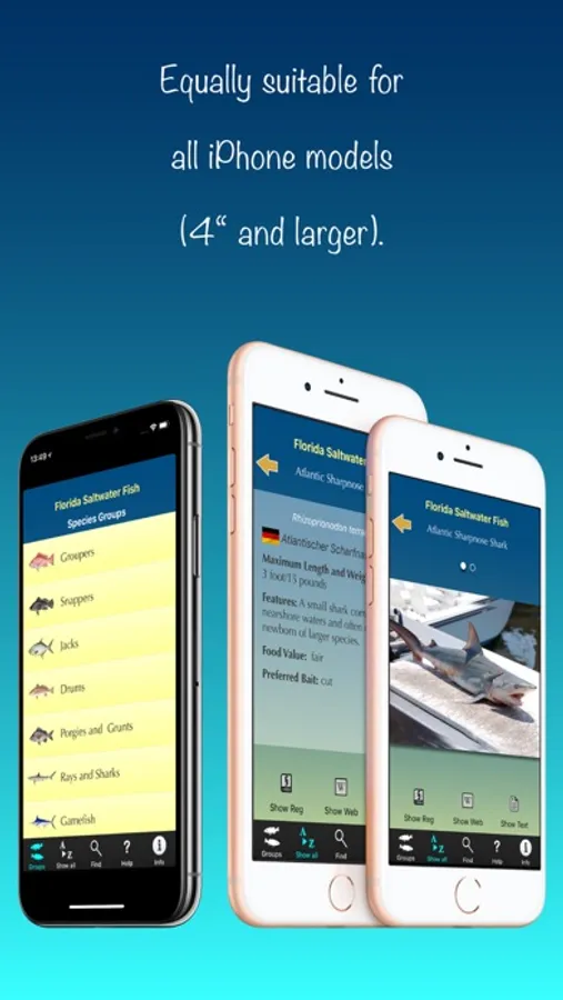 This app shows the 57 most common saltwater fish species found in the Atlantic and Gulf of Mexico off the Florida coasts. For each fish there are two or three high-resolution pictures, a brief description, a link to view the corresponding Wikipedia pages within the application window, and extensive regulation information for recreational fishing. All descriptive information is in English, the animal names are also shown in scientific (Latin) denomination and in German.
