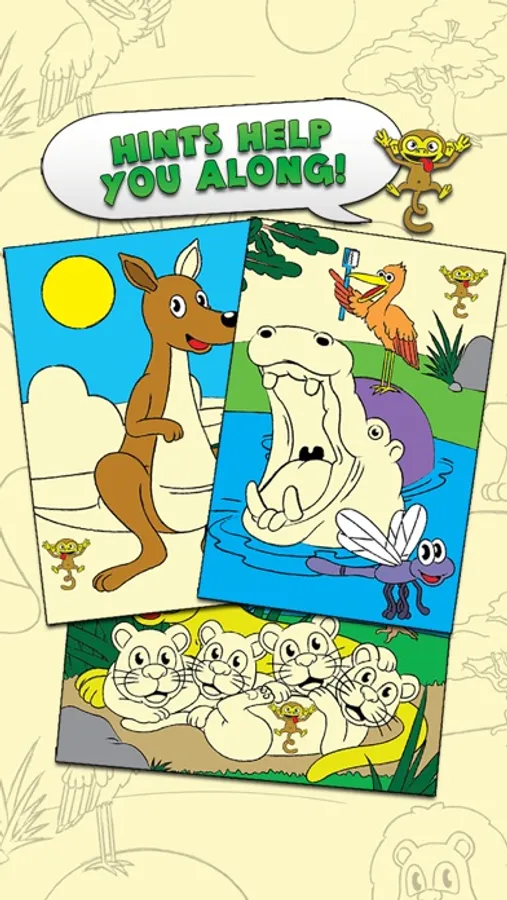 As you complete each page new things appear to color! Touch the barrel and monkeys pop out, Touch each monkey to put silly hats on their heads!
