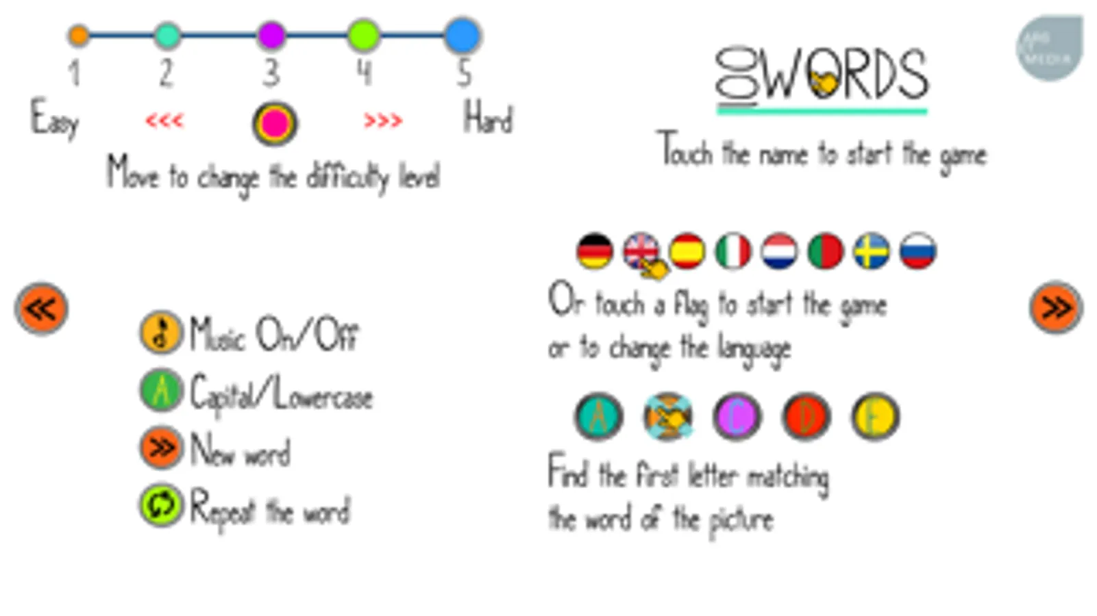 The first level for younger children, who can not yet read, can listen directly to the pronunciation of the word shown in the drawing by simply touching the letter key.
