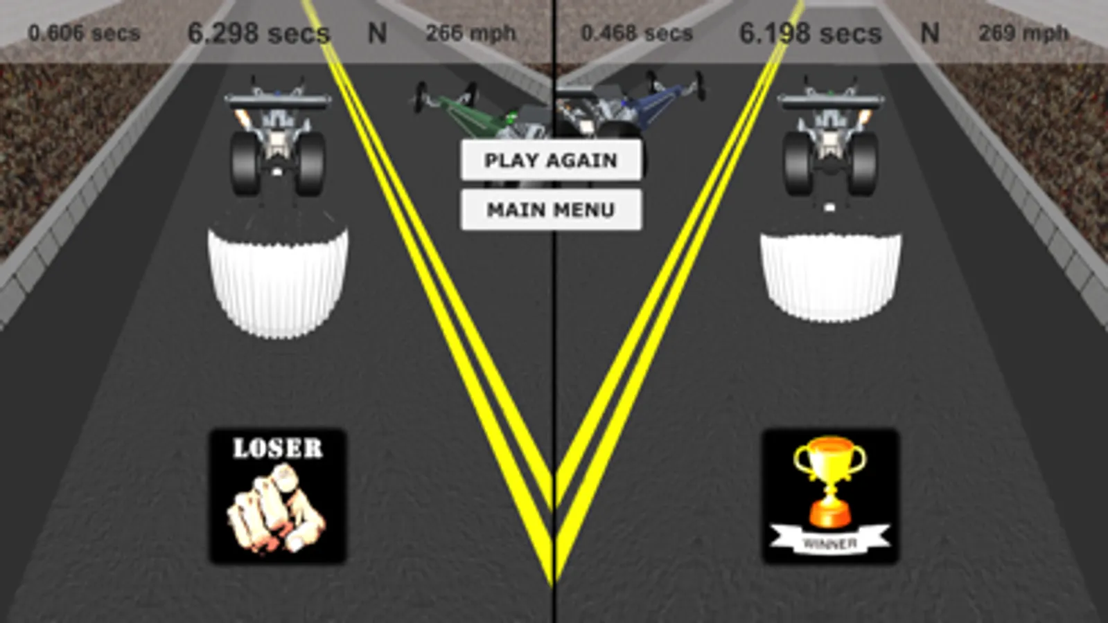 Race down a 1/4 mile drag strip in a 8,000 hp 280 mph dragster simulator while competing against your friends, family, and even your worst nemesis for the lowest race time, fastest speed, and quickest reaction time in 3D!