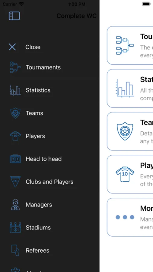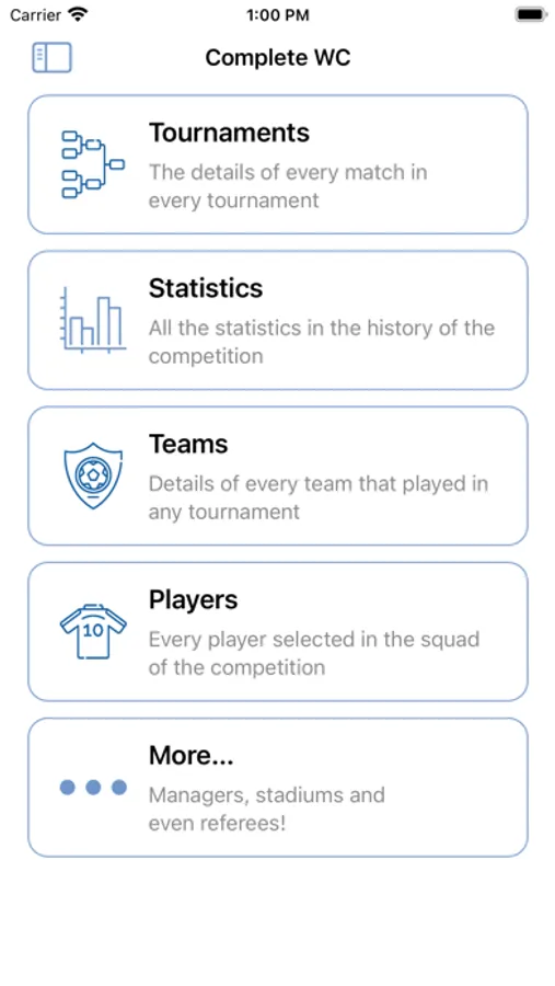 Not just statistics like other apps offer--but every detail--of every tournament—of every match—of every goal scored—of every player!