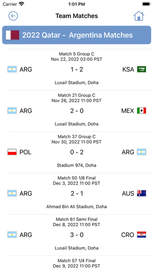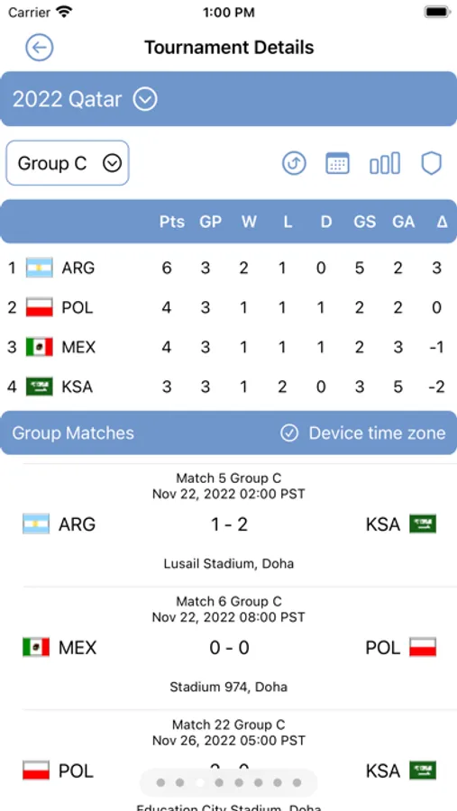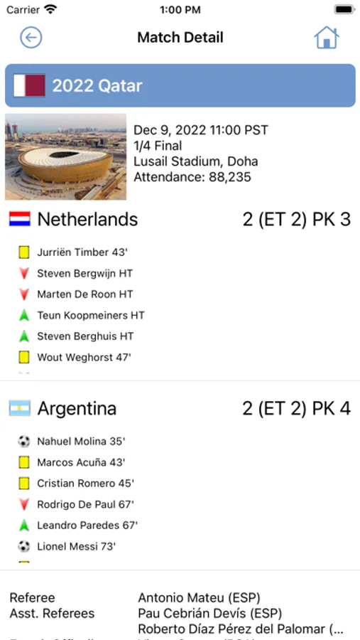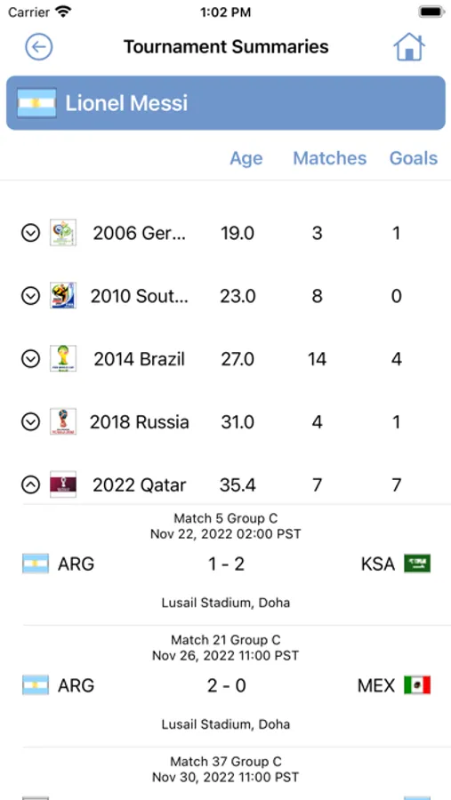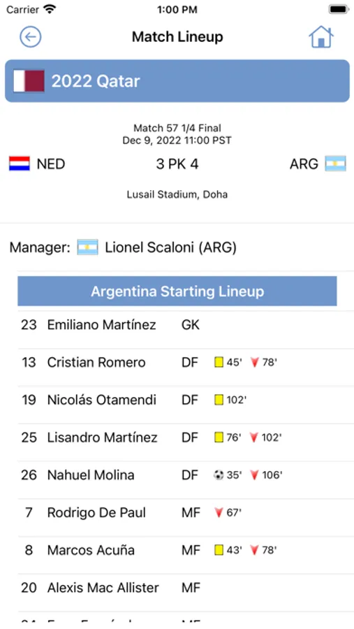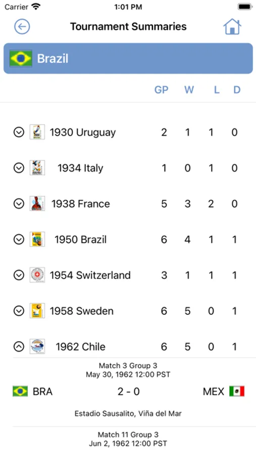 View the details of every tournament: the entire group stage matches, group standings, and second round matches (every format). Drill down each match to see all the details of every match (starting lineups, substitutions, goal scorers, and cautions). Even penalty shootout results are included! All the statistics of each tournament is right at your fingertips.