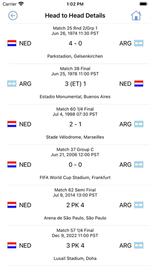Pick any two teams and see all the matches between them in the tournament history; then just tap on any match to see all the details.