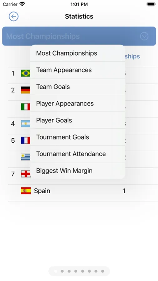 Quickly view all the important all-time statistics, such as most championships, most team and player goals (all-time and single tournament), team and player most appearances, and much more. Which player scored the most goals in a single tournament? The answer is right here! Of course, you can drill down from every statistic and see the details.