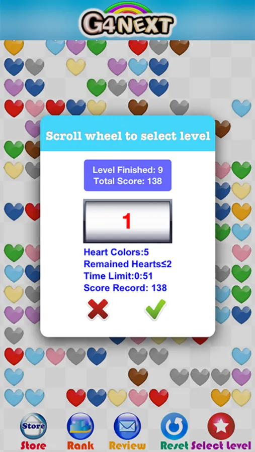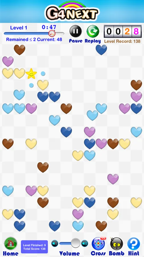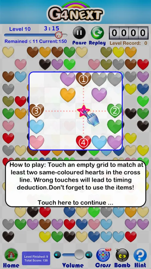 Touch an empty grid to match at least two same-coloured hearts in the cross line. Wrong touches will lead to timing deduction.Don't forget to use the items!