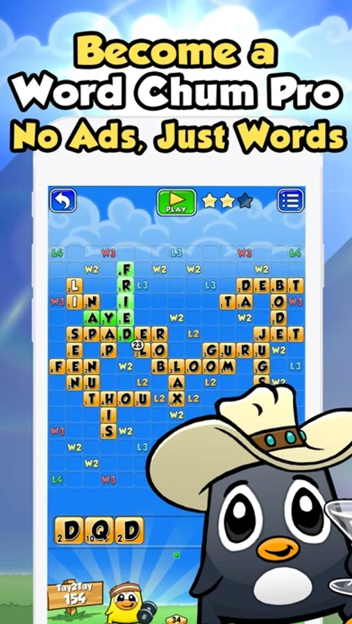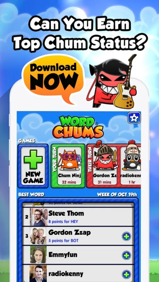 Earn experience points with each word played and level up to become King or Queen of the Chums. Show off your “wordly” prowess by climbing your way to the top of the weekly leaderboards.