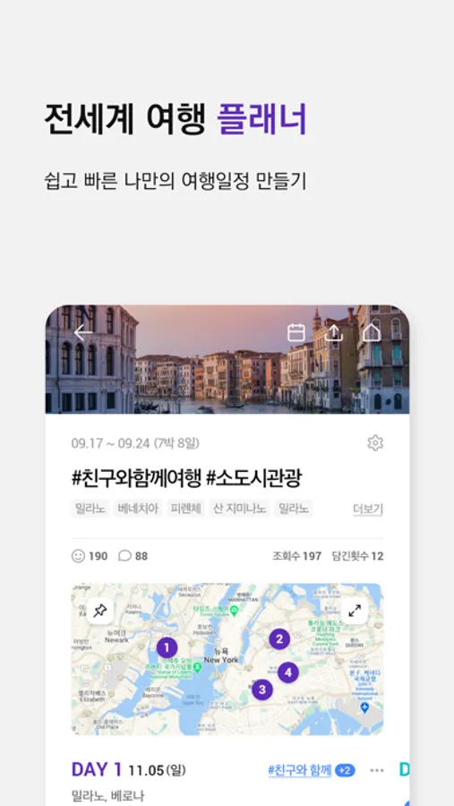 쉽고 빠른 나만의 여행일정을 만들고 공유해보세요.