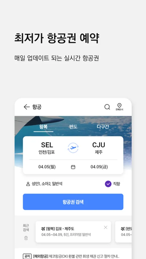 매일 실시간으로 업데이트 되는 최저가 항공권을 예약해보세요