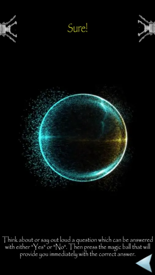 Подумай или громко скажи вопрос, на который можно ответить "Да" или "Нет". Потом нажми на магический шар, который немедленно скажет тебе правильный ответ.