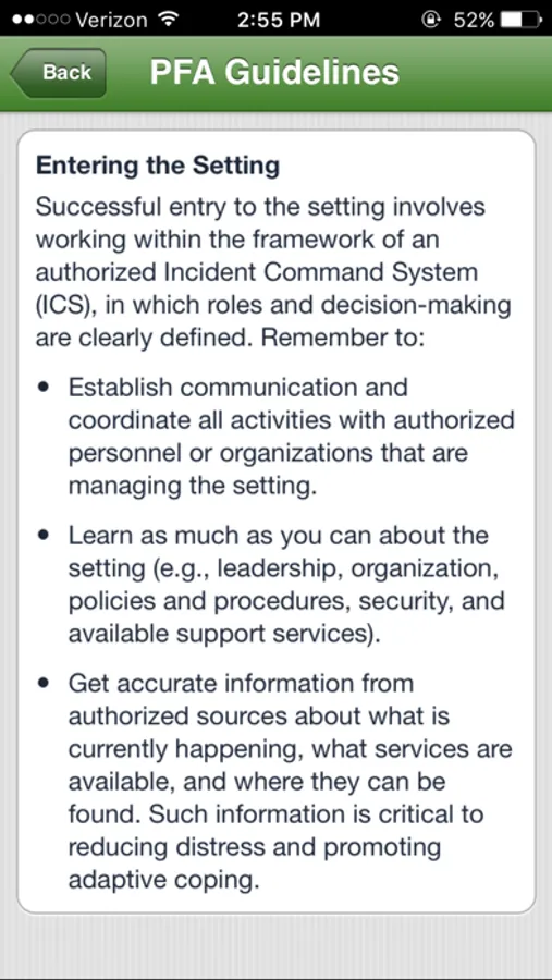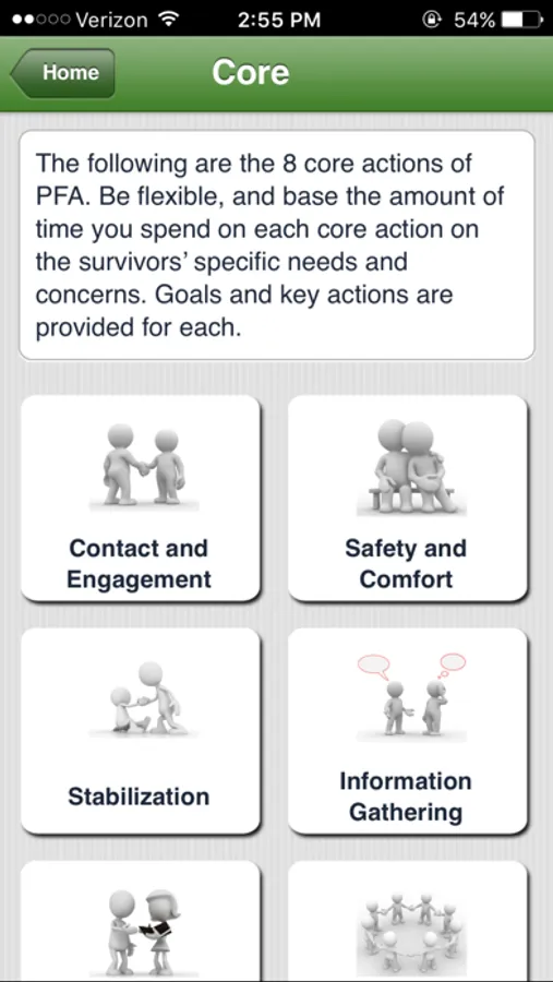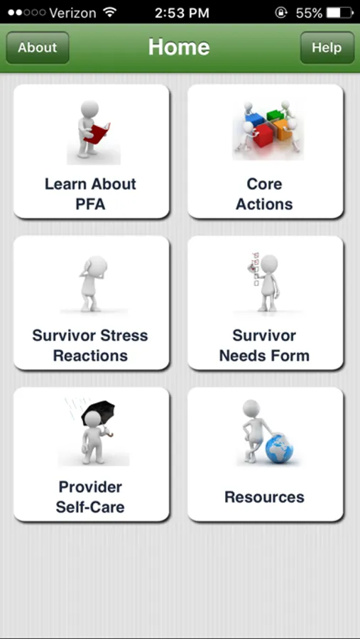 PFA Mobile was designed to assist responders who provide psychological first aid (PFA) to adults, families, and children as part of an organized response effort. This app provides responders with summaries of PFA fundamentals, PFA interventions matched to specific concerns and needs of survivors, mentor tips for applying PFA in the field, a self-assessment tool for readiness to conduct PFA, and a survivors' needs form for simplified data collection and easy referral.