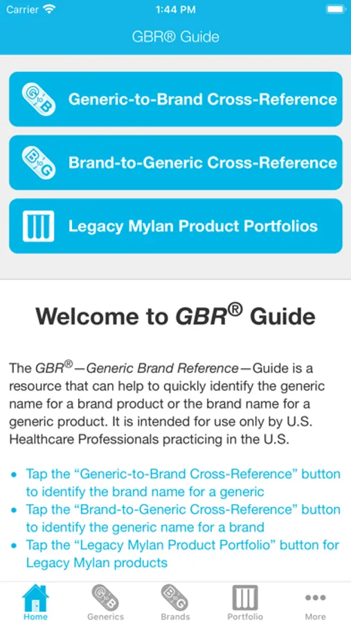 The GBR Guide app, which contains a scroll-able alphabetical index of drug products and uses smart search capabilities, includes the following features: