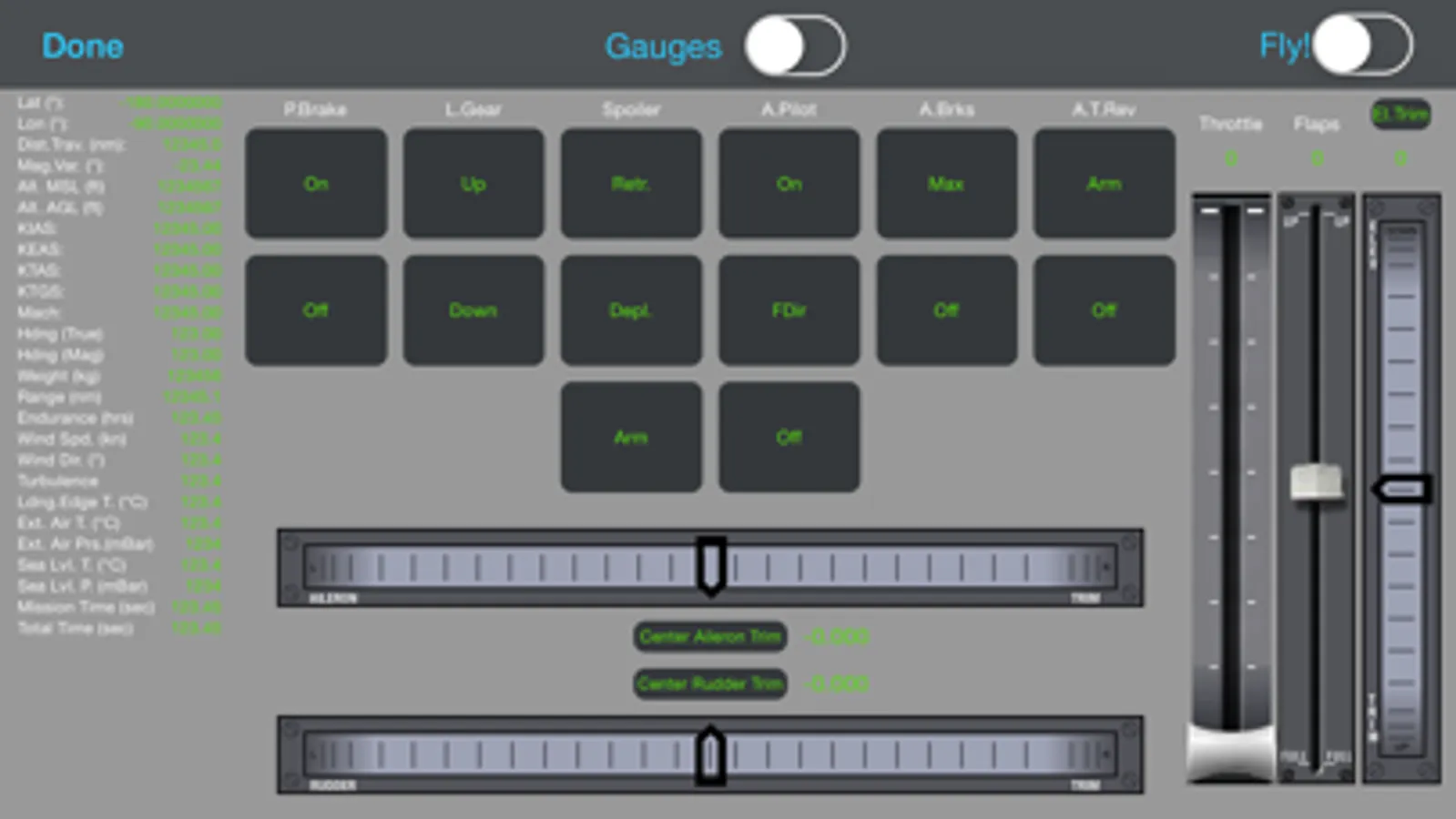 - Thrust, Flaps, Trims, Brakes, Landing gear, Position, Altitude, Speed (FlyHUD iAP)