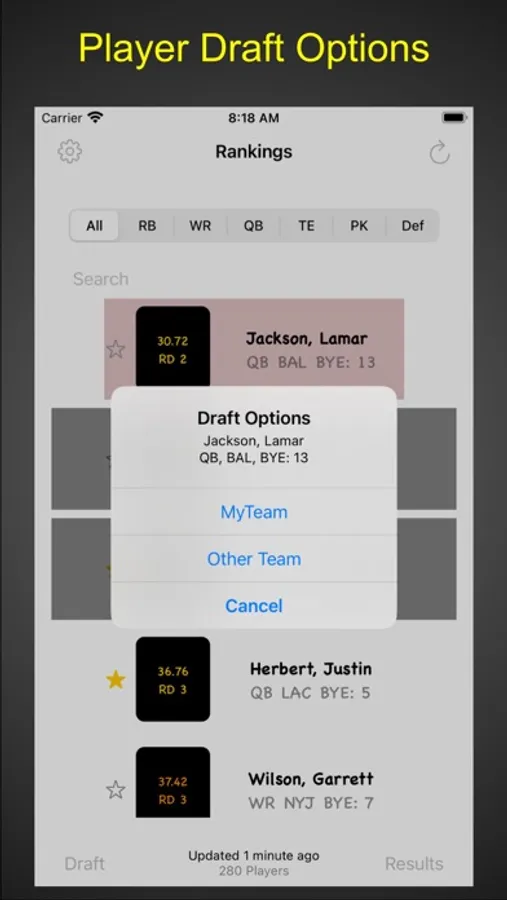 Select a player and tap the Draft button. Choose if the player is going to be on Your Team or Other Team. Finally, a fantasy draft app designed for ease of use!