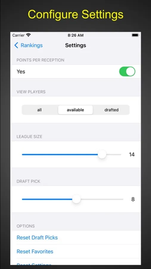 The Settings allow you to view All Players, Only Available Players (my favorite), and Only Drafted Players.