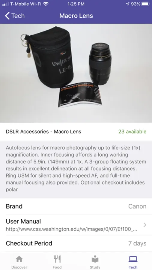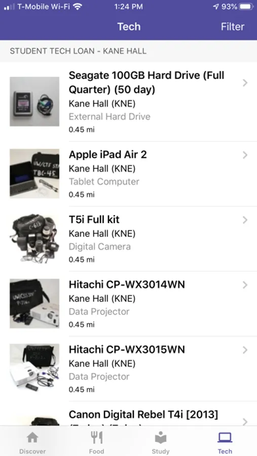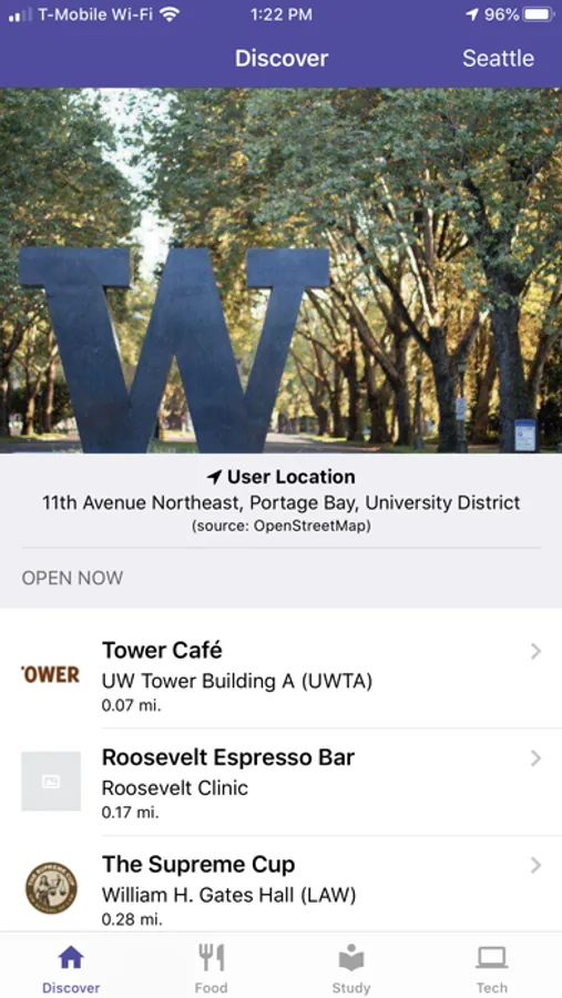 Scout includes over 244 study spaces on the UW Seattle campus, 68 study spaces at UW Tacoma, 69 study spaces at UW Bothell, 55 places to grab food, and 157 tech items for use or check-out.