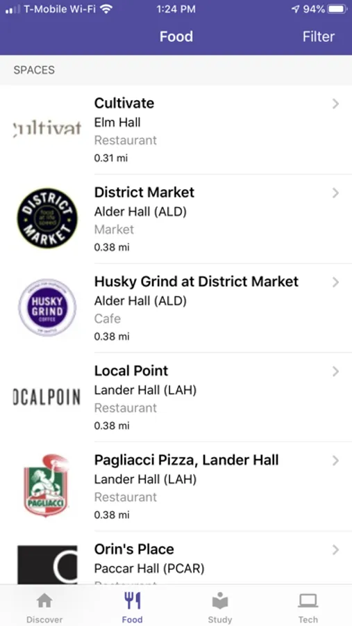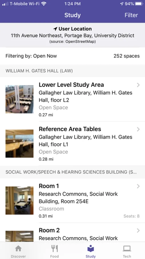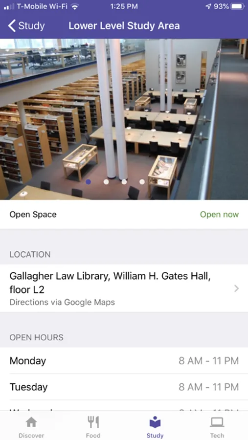 - List View — See a photo of each study space, location, type of space, and number of seats. Tap any space in the list for more details. Some spaces show real-time availability of computers.