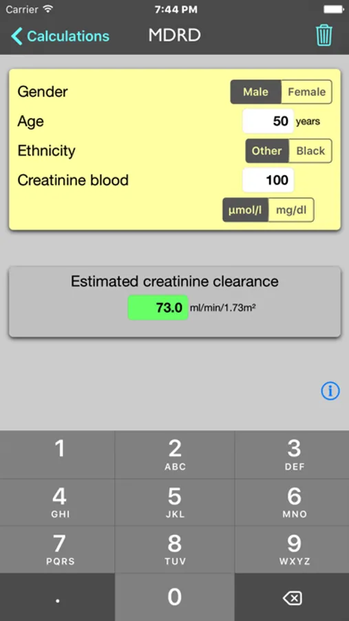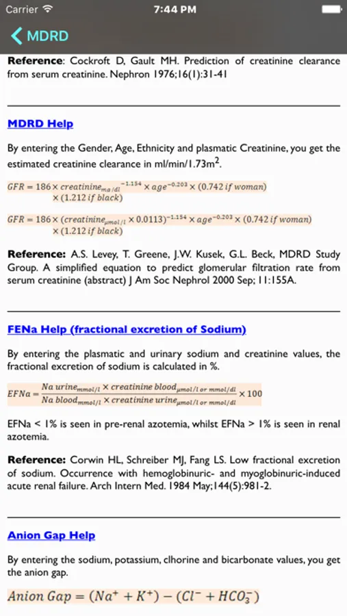 - Specific module that allows the user to make calculations in this field: Cockroft-Gault, MDRD, fractional sodium excretion, anion gap, measured creatinine clearance, calculated plasmatic and urinary osmolarity, sodium, water and bicarbonate deficit.