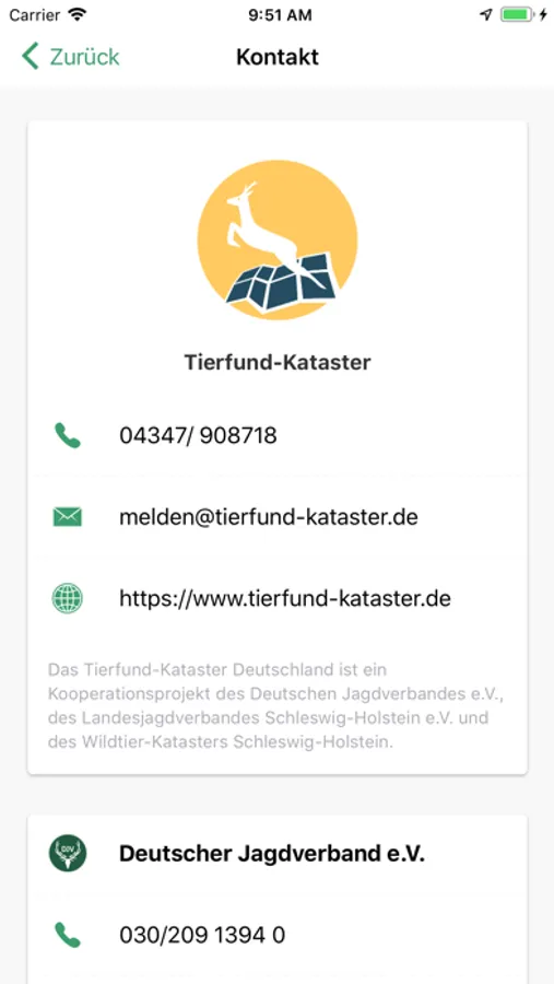 https://www.tierfund-kataster.de übermittelt. Die Ergebnisse werden dann ausgewertet, um die Gefährdungen von Wildtieren zu ermitteln, Wildunfallschwerpunkte zu identifizieren und um geeignete Schutzmaßnahmen einleiten zu können.