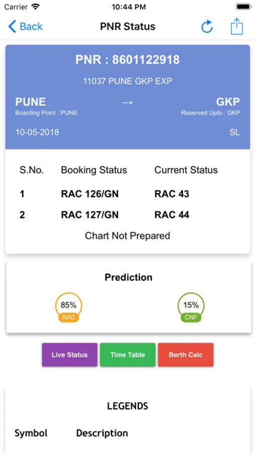 Live running train status, in-train live map, timetables, station status, PNR Enquiry, a unique berth & seat calc, and reservation date calc.