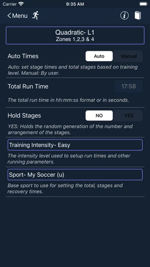 You can configure manually each stage’s training intensity and time durations. You can combine random and manual effects, making this App fairly versatile to adapt to your needs.