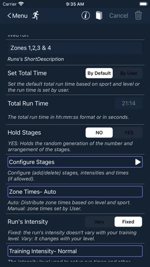 Using the In-App Upgrades you can upgrade the App to include the Training Zones Module. This module allows you to configure a time distribution scheme and save it as a sport, which can be used it in any run as you use the default sports.
