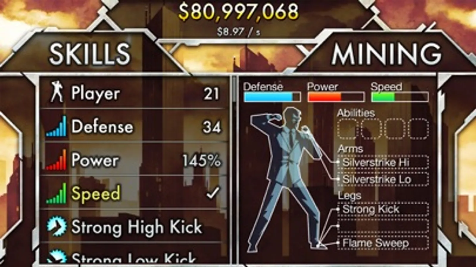 The Executive combines a high-speed combat system, timing-based running and platforming, 120 hand-crafted levels, a full inventory of moves and upgrades, and a simple mining company simulation for earning money, all into one cohesive experience. The fighting engine evokes a cross between Street Fighter II and Zelda II: The Adventure of Link, with controls designed from scratch to be ideal for touch screens. The platforming (or “stunt”) segments require precise timing, similar to Elite Beat Agents but with an emphasis on visual timing instead of musical rhythm. Both of these mechanics are brought together by the SP bar, which allows you to execute gesture-based special moves like flame kicks, health restoration, and even morphing your character’s arm into a silver spike to impale foes.