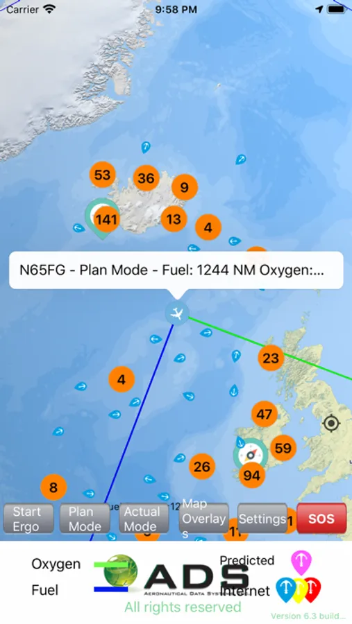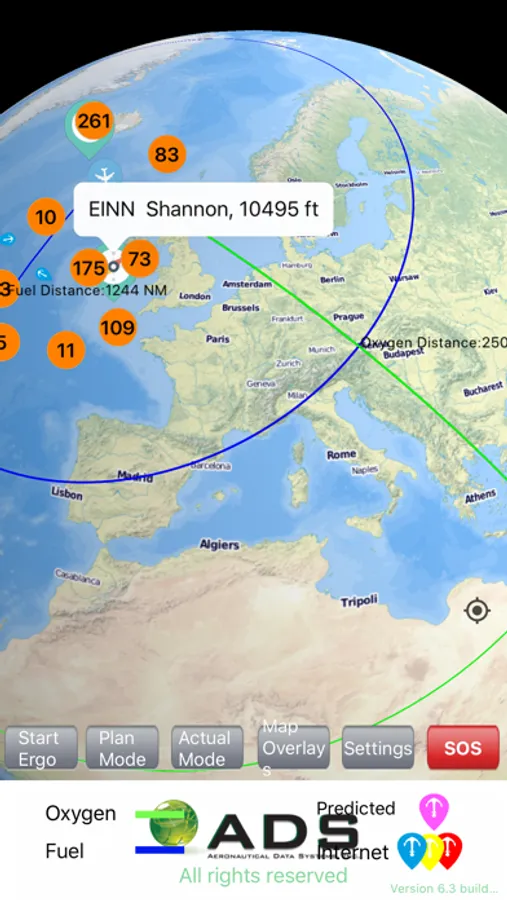 The Ergo 360 app calculates an aircraft’s fuel and oxygen consumption at a given altitude and plots their ranges as different colored rings on an interactive map. The pilot can change the proposed altitude and see the results of these changes in the rings on the map display. Utilizing a worldwide airport database, Ergo displays the airports which fall into the area where the two rings overlap, indicating that there is an adequate supply of each resource to safely land at any of these airports. The Ergo 360 system features a "Planning" mode, which simplifies flight planning, and a dynamic, in-flight "Actual" mode, which can be used in the event of a partial or full decompression situation.