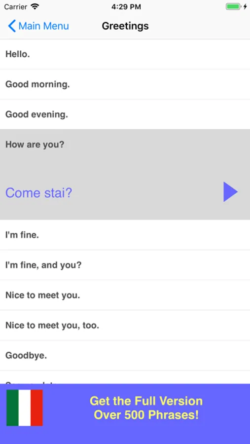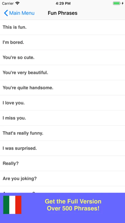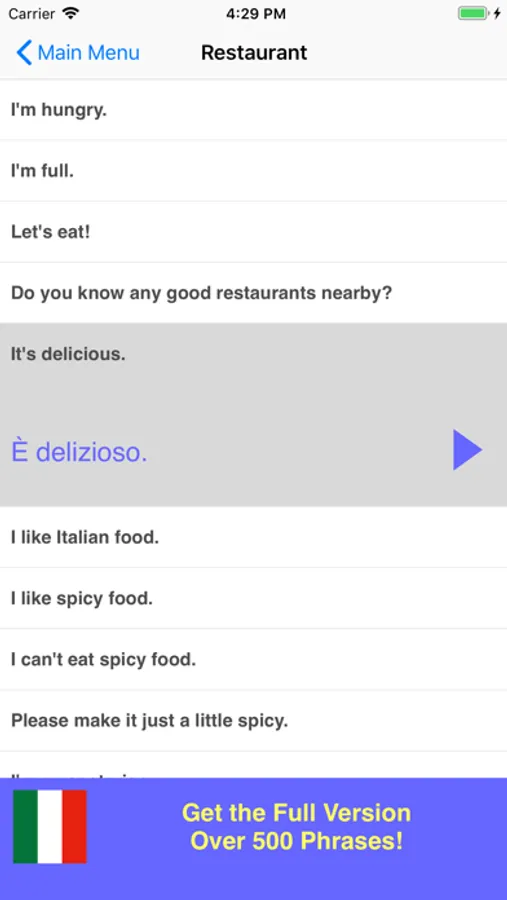 Great for travel or study! Speak Italian Travel Phrasebook Lite is an easy to use talking phrasebook app for the Italian language. Each phrase is displayed in Italian and English translation. Hear the audio for each phrase in a clear, pleasant voice from a native Italian speaker. This free version of the app contains dozens of useful words and phrases in the following categories: