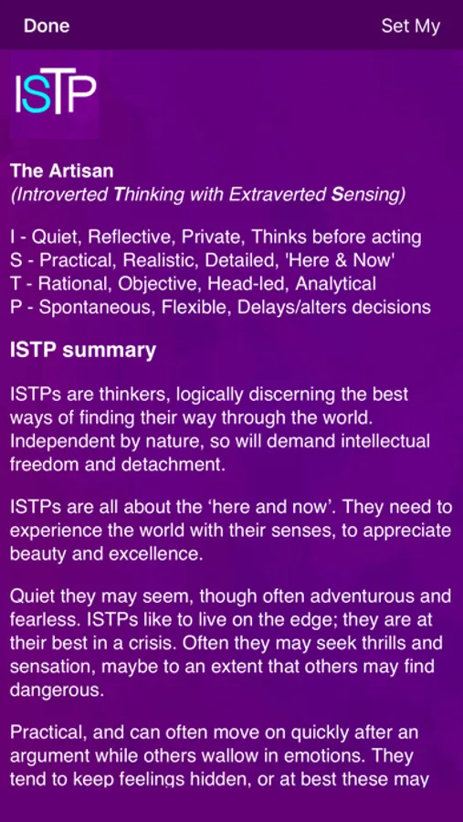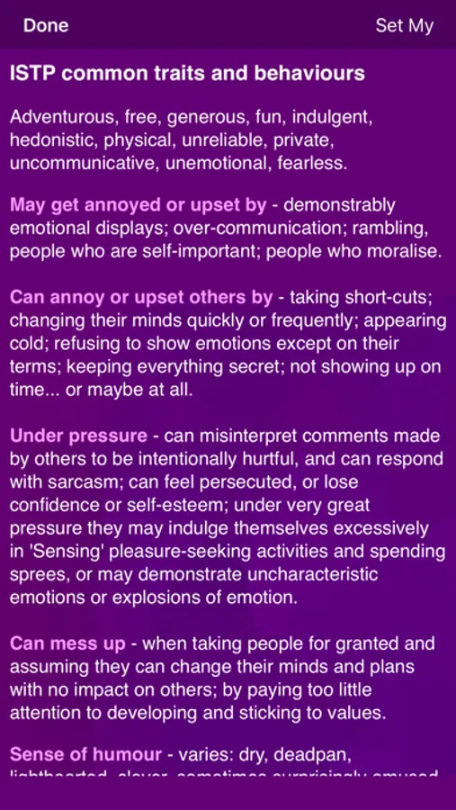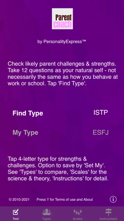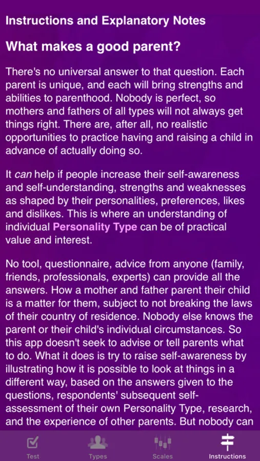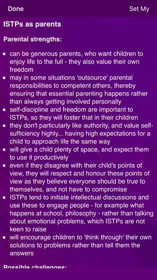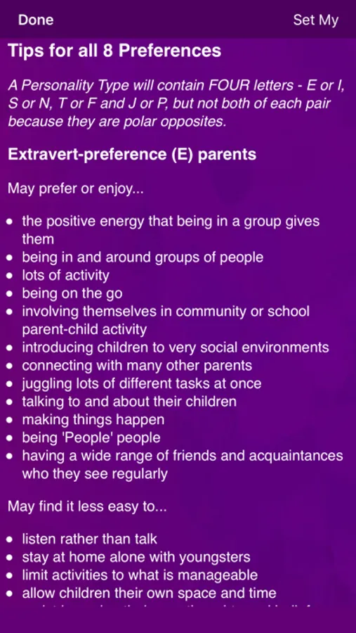 You answer a few simple questions. Then you can browse through your likely parental strengths, possible challenges and ideas for a whole range of personality types, not just your own. Your partner, if you have one, can do the same, and you can compare and contrast notes. What each Personality Type may prefer or enjoy as a parent, what they may find it less easy to do, ideas to take a different approach. You will see different perspectives, a perspective which (for example) your child may have.