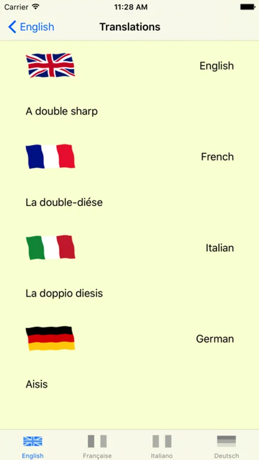 Four list of words and terms in four languages - English, French, Italian and German. You can search in each of the four languages, and it will bring you to the translation page with the equivalent words of the four language.