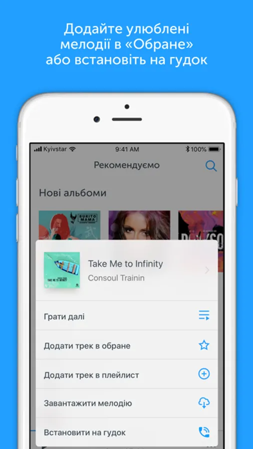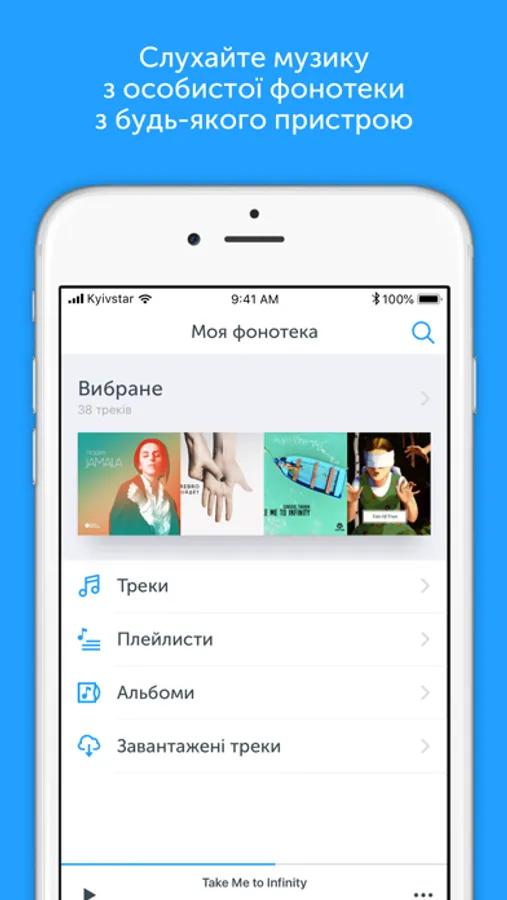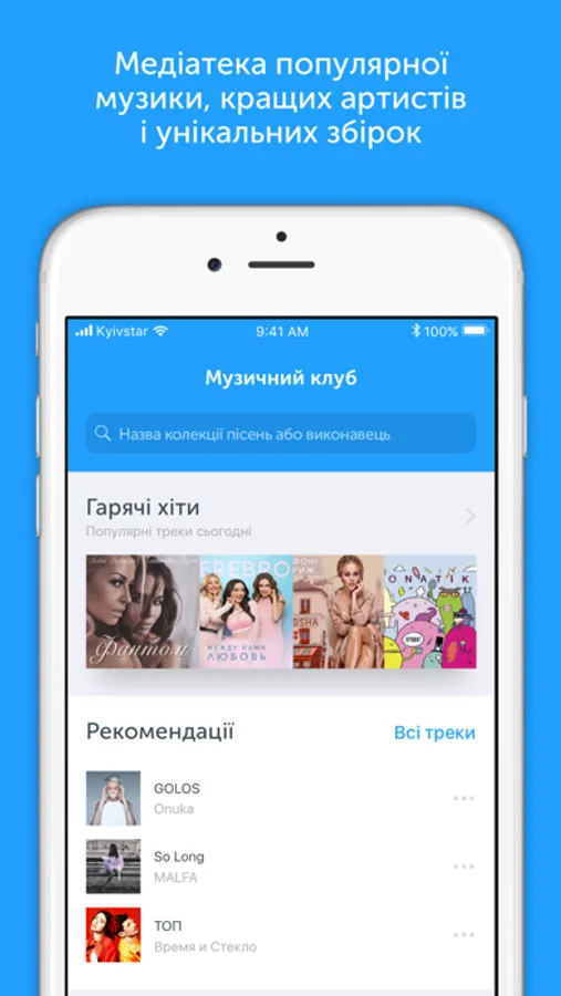 Music club - it's your universal music player by Kyivstar. From now on, your favorite legal music is always with you. Popular albums, tracks and artists. Easy navigation and search by catalog. The service is available to all subscribers of Kyivstar.