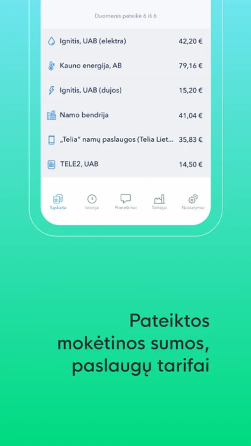 • Paslaugos teikėjams pateikus informaciją, programėlėje bus įkeltos mokėtinos sumos, naujausi paslaugų tarifai.
