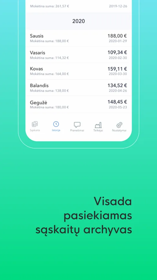 • Įmokų istorija bus saugoma programėlės archyve, o grafikai istorijos lange padės suprasti kam ir kiek išleidžiate.