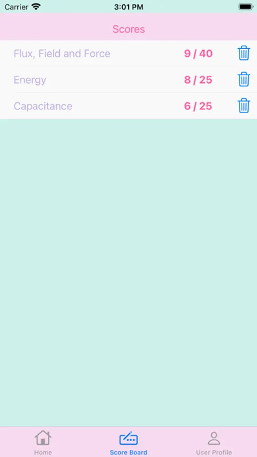 -Each Topic Score can be deleted to reset the topic quiz