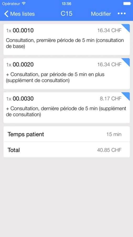 iTarmed contient toutes les informations relatives à chaque position tarifaire. Interprétations, règles d’utilisation, temps dédié au patient, et bien plus. Le contenu de chaque position peut être imprimé via AirPrint ou envoyé par email.